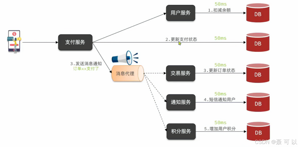 支付服务完成之后只需要发送消息给消息代理,让消息代理通知其它服务