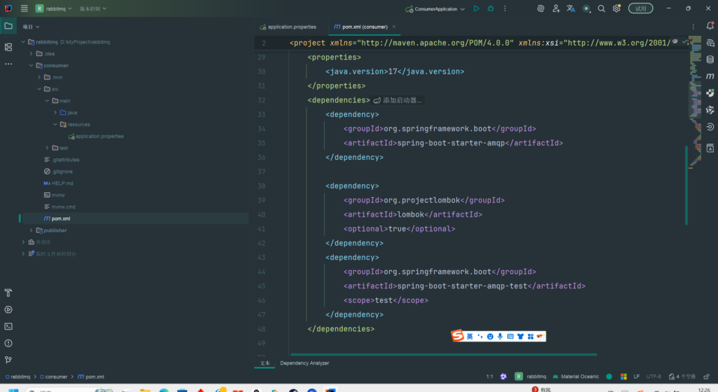 在 consumer 和 publisher 模块的 application.yml 中分别编写与 RabbitMQ 有关的配置信息