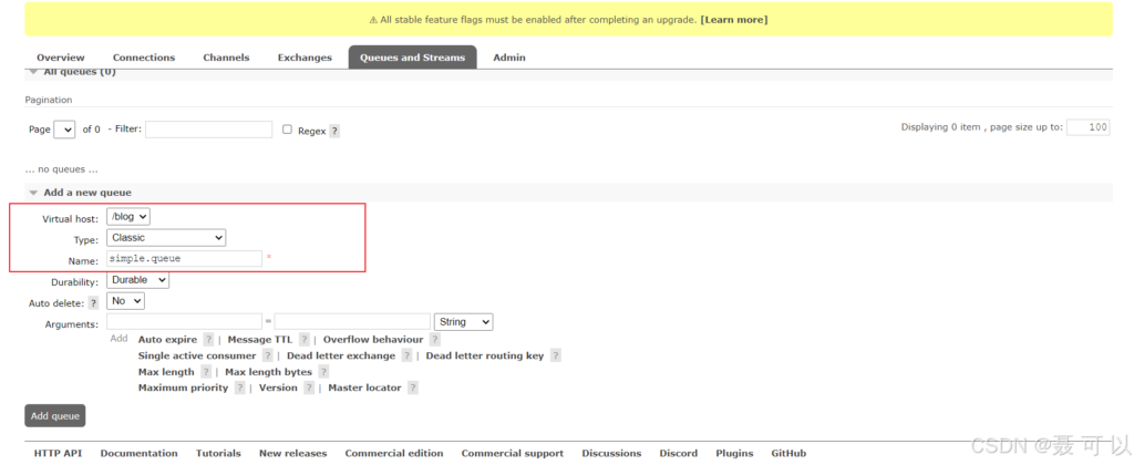 创建 Queue 时,如果没有指定 durable 属性,则 durable 属性默认为 true