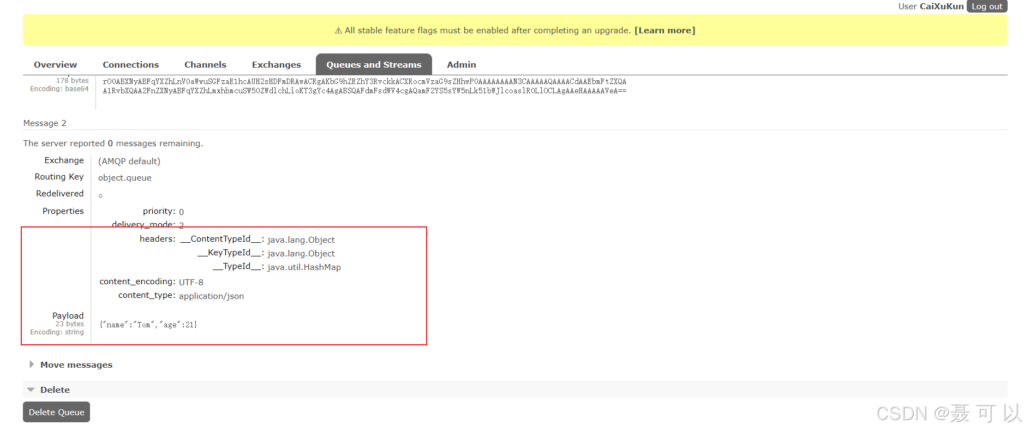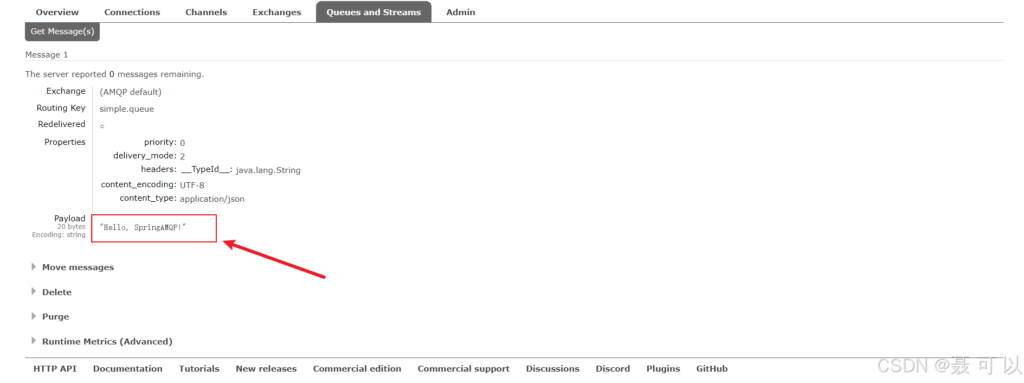 成功发送消息后,我们在 RabbitMQ 的控制台查看消息的具体内容