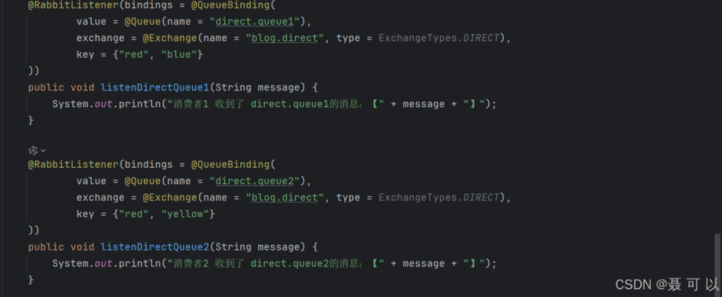 再改造 consumer 服务的 RabbitMQListener 类的监听 direct.queue1 队列和 direct.queue2 队列的方法