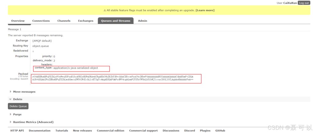 可以发现,消息的内容类型为 application/x-java-serialized-object,并且消息的内容也变成一堆乱码